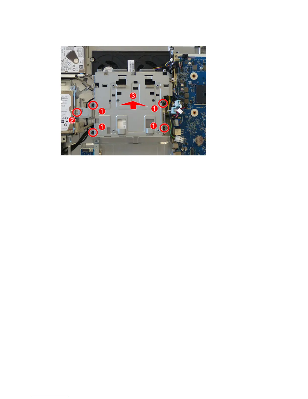 7. Remove the four black Torx screws (1) and the silver Torx screw (2), and then remove the bracket from