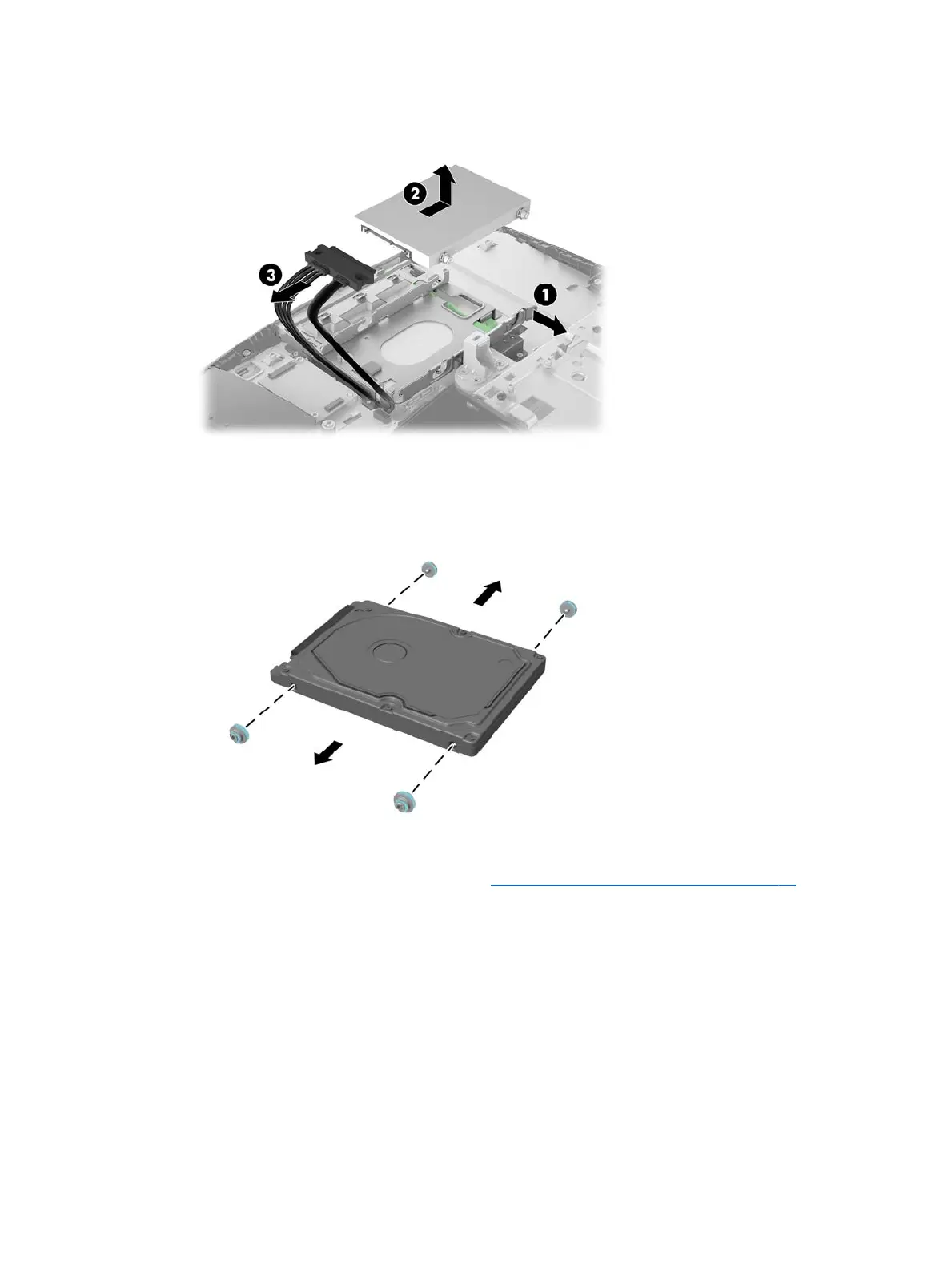 7. Disconnect the power and data cables from the hard drive (3).