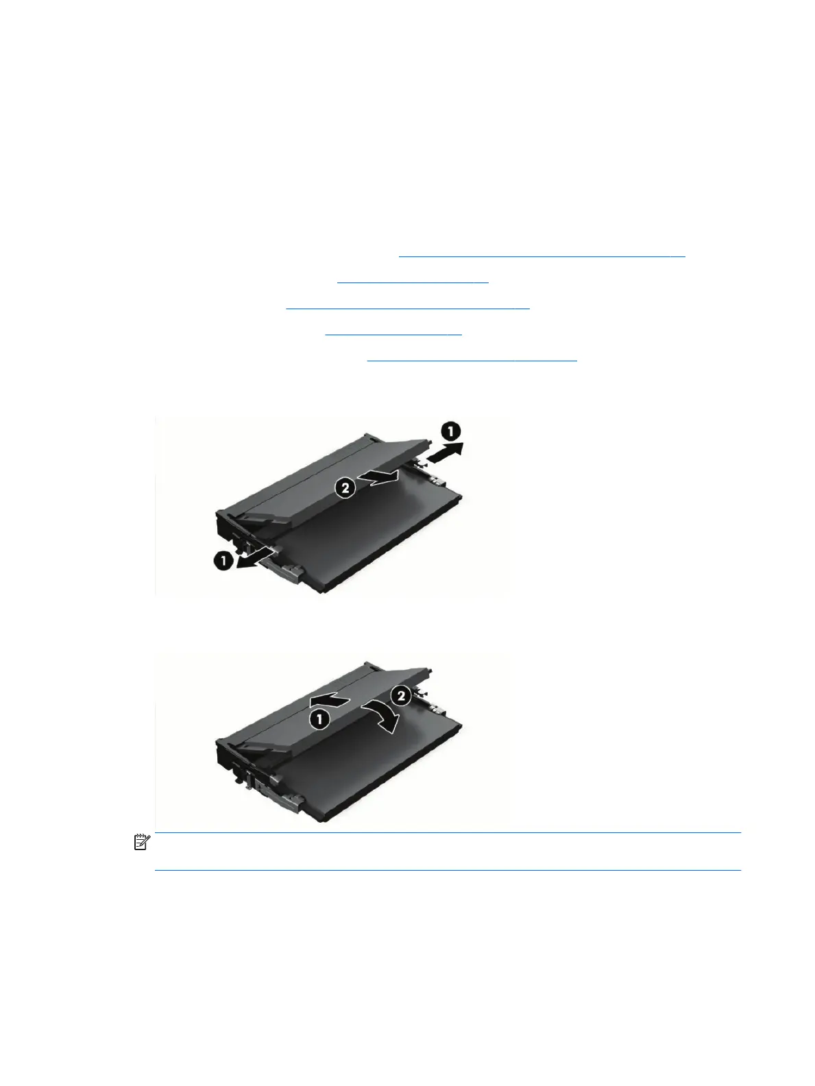 6. To remove a memory module, press outward on the two latches on each side of the SODIMM (1), then