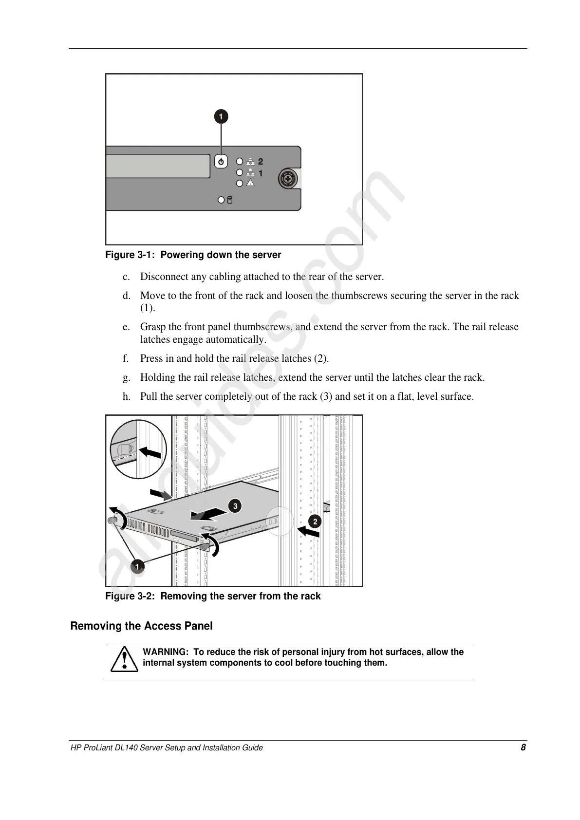h. Pull the server completely out of the rack (3) and set it on a flat, level surface.