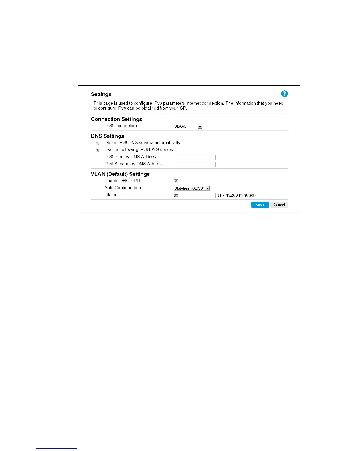 • IPv6 Connection: Select SLAAC for the IPv6 address connection mode.