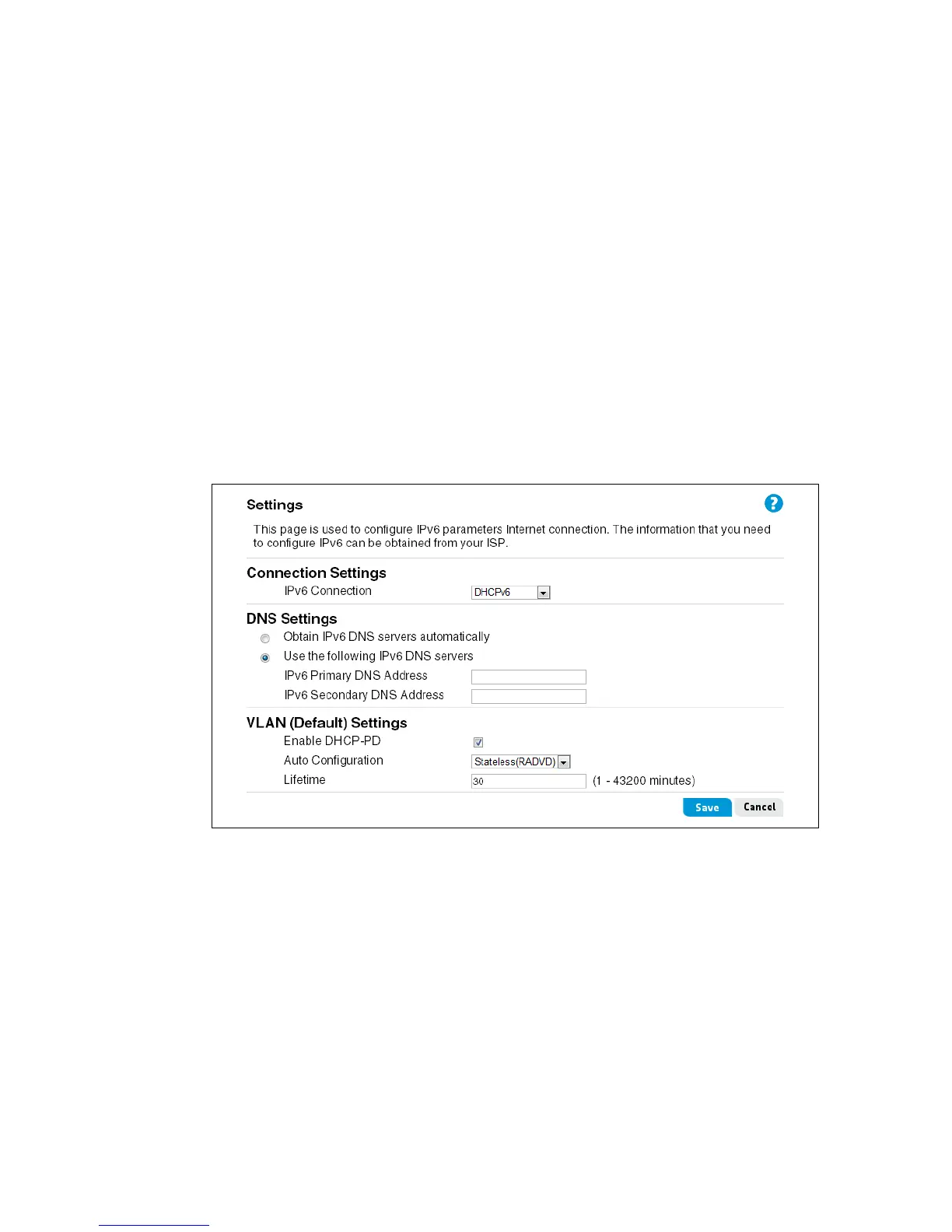 • IPv6 Connection: Select DHCPv6 for the IPv6 address connection mode.