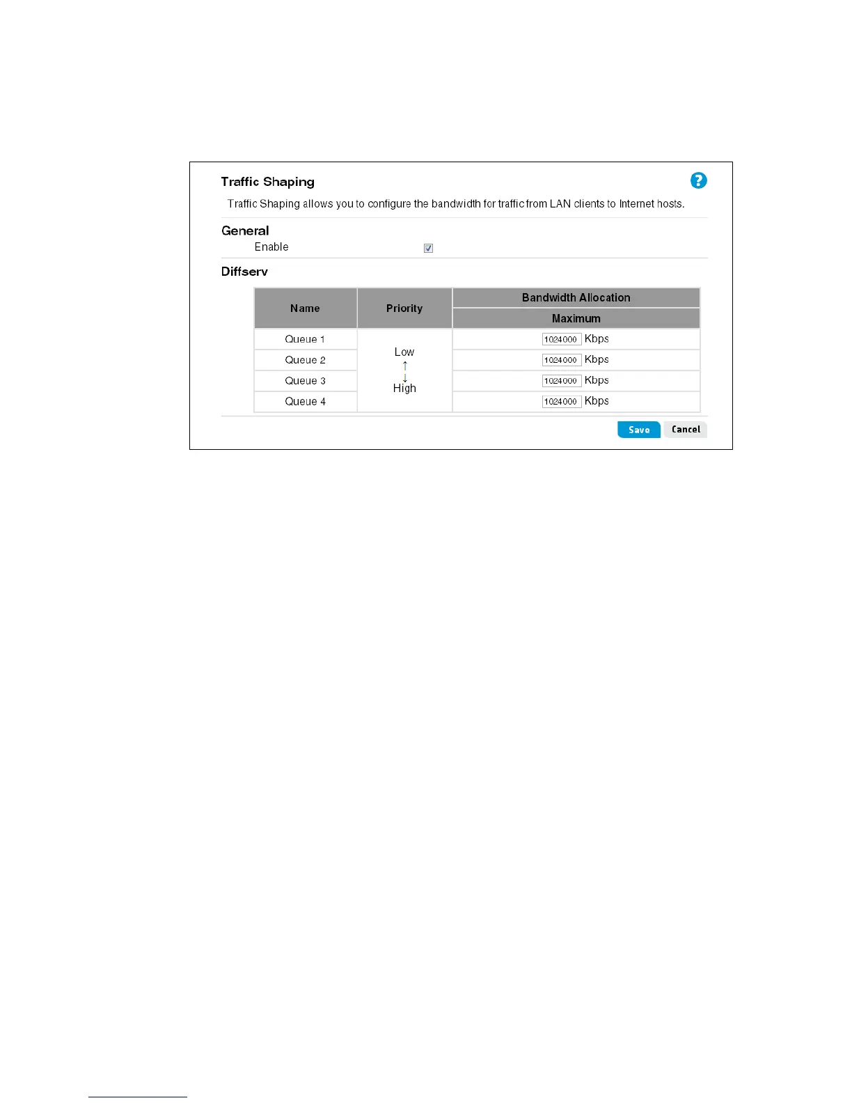 The Traffic Shaping page enables the bandwidth of the WAN port output queues to be