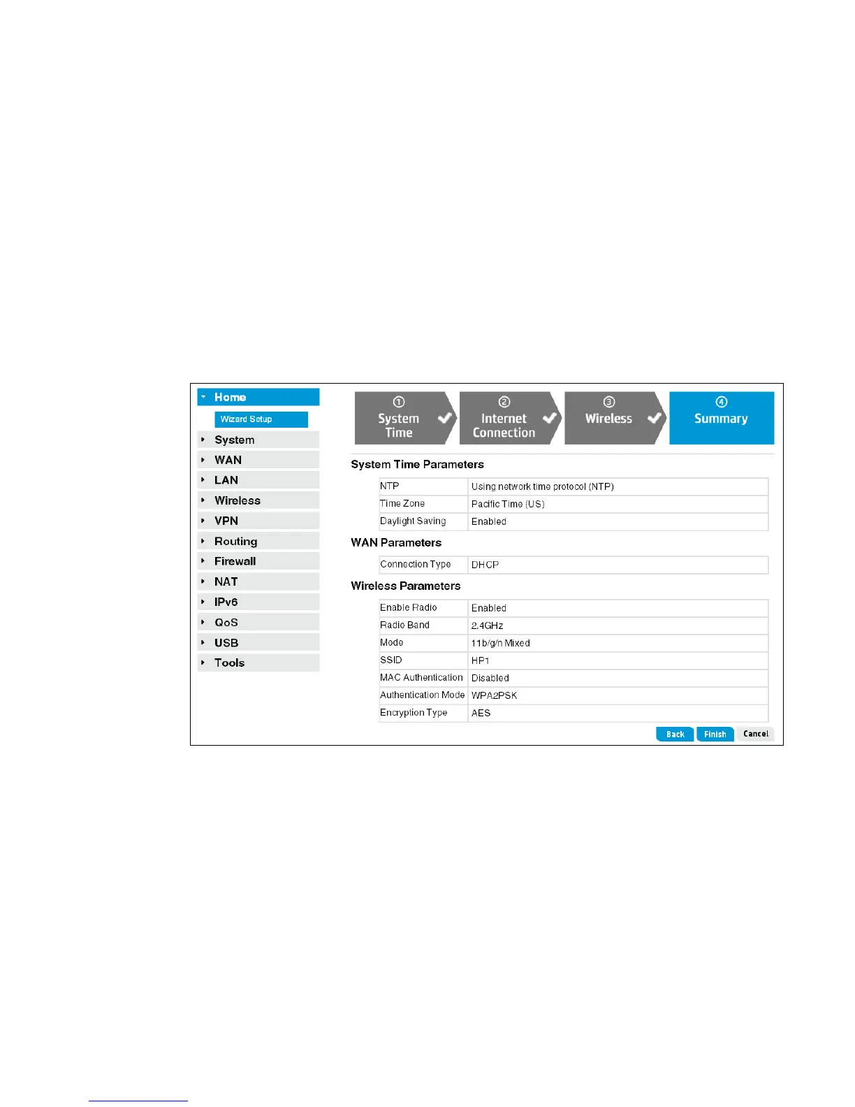 Confirm the settings, and then click Finish. The router reboots and the HP R110/R120 is
