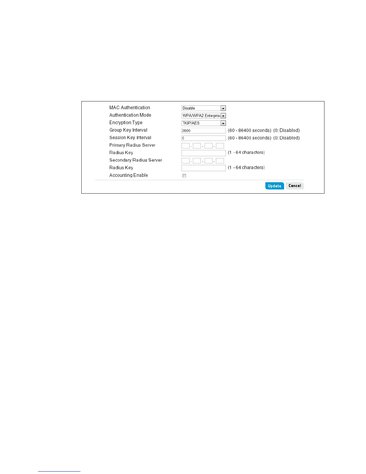 Select WPA/WPA2 Enterprise to display all settings for mixed WPA/WPA2 security.