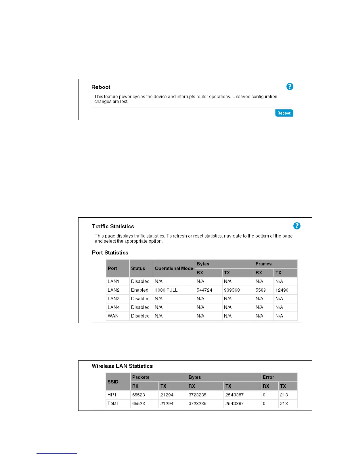 Displays the WAN and LAN port status together with the number of frames/bytes that have