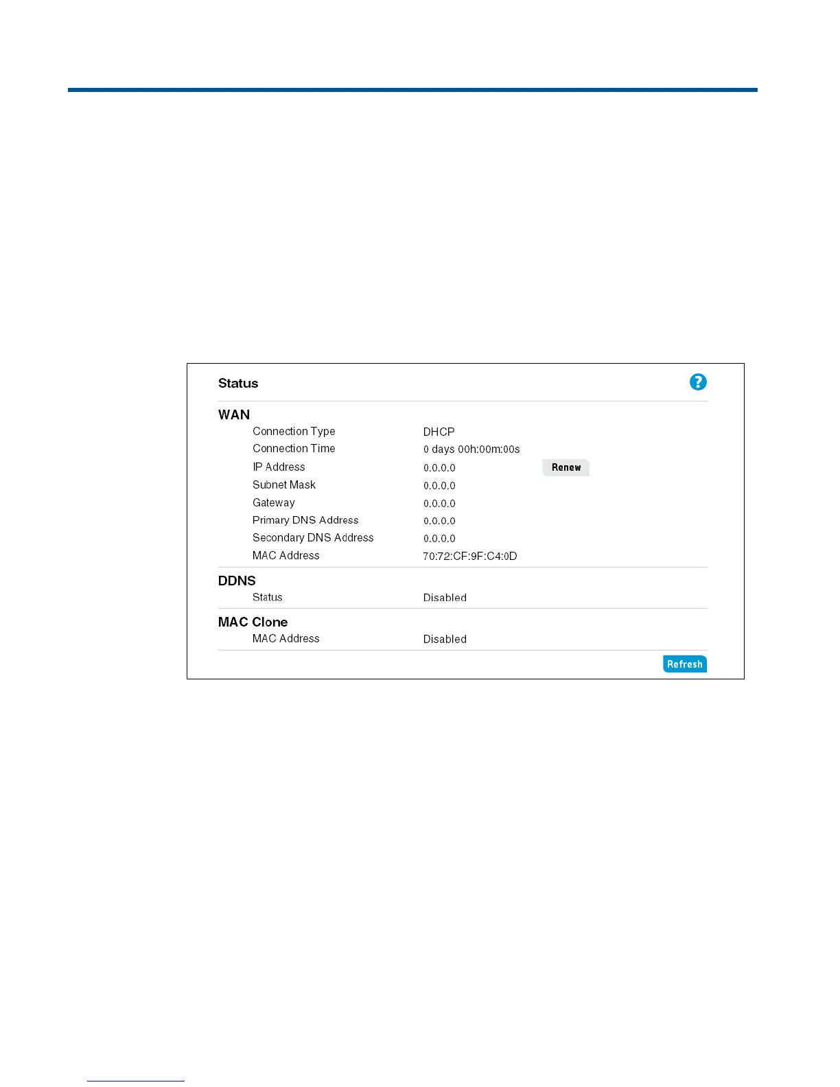 The Status page displays the setting of the WAN interface. If you are using DHCP as the