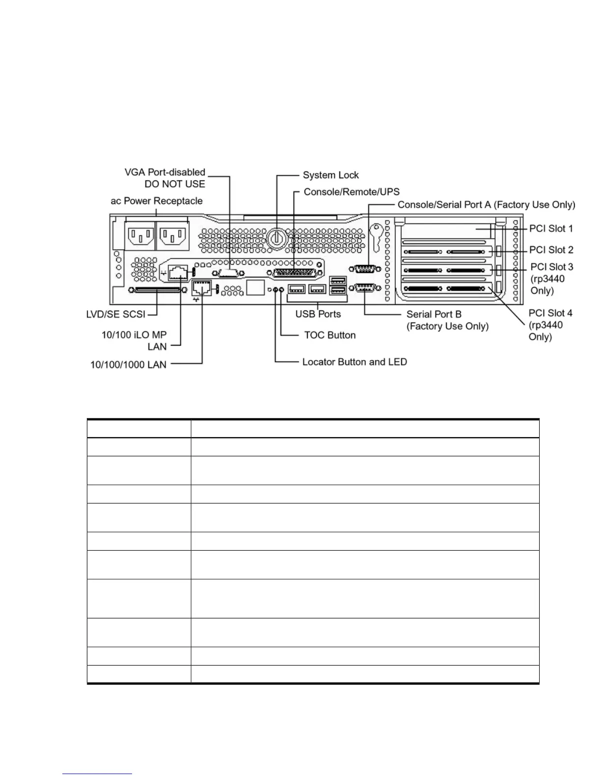 The rear panel of the HP 9000 rp3410 and rp3440 servers includes communication ports, I/O