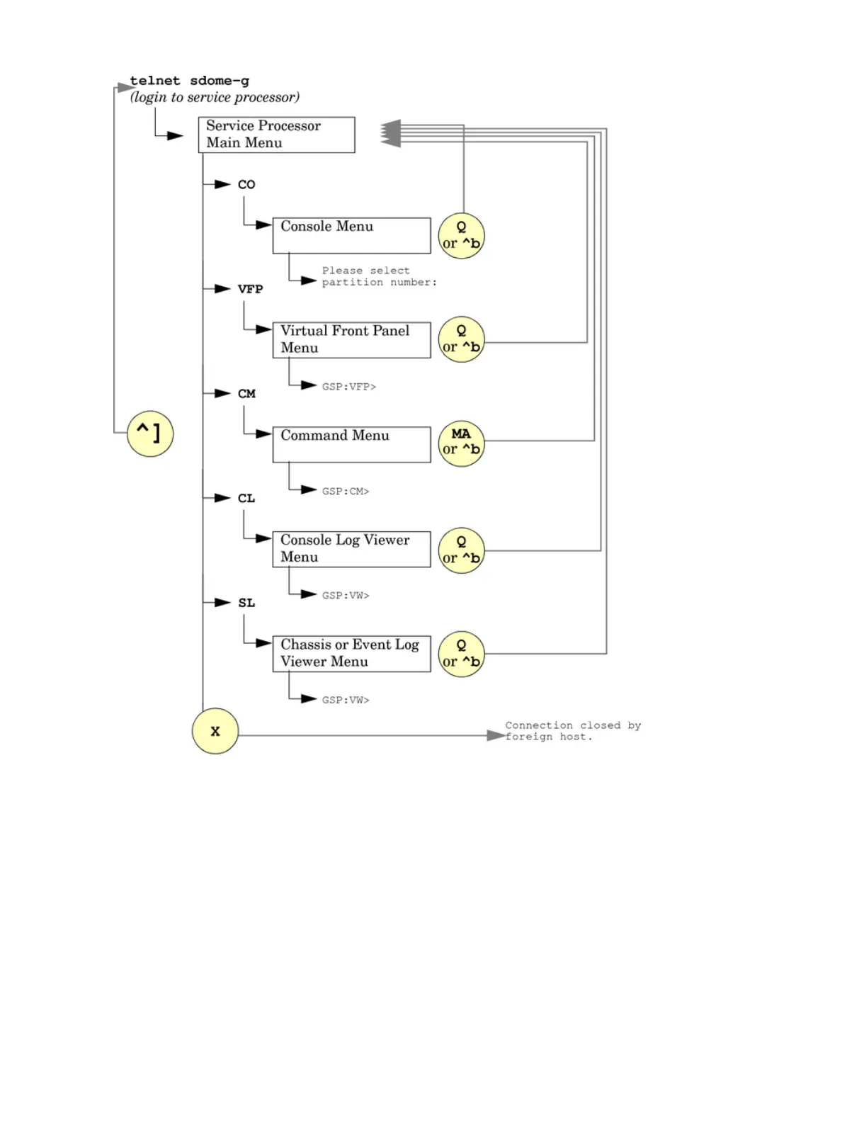 Figure 2-2 Navigating through Service Processor (MP or GSP) Menus