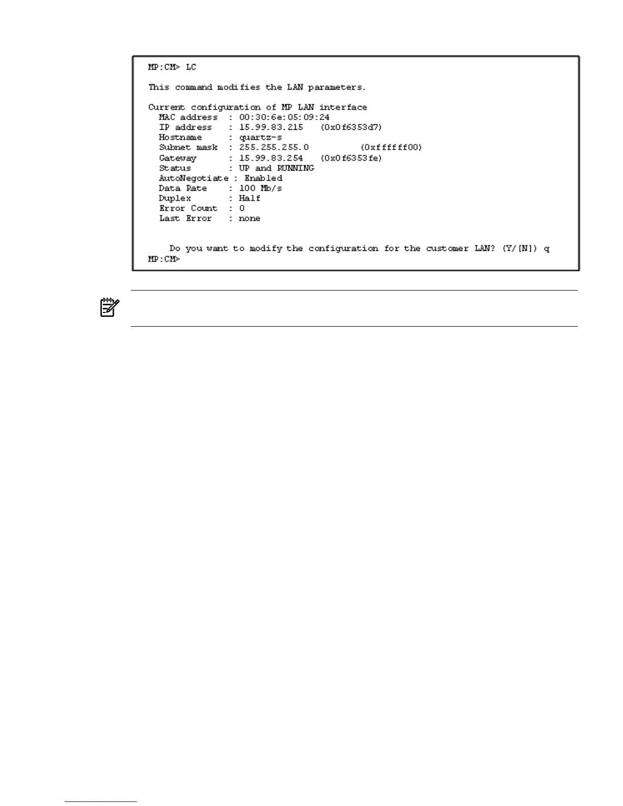 11. To check the LAN parameters and status, enter the ls command at the MP Command Menu