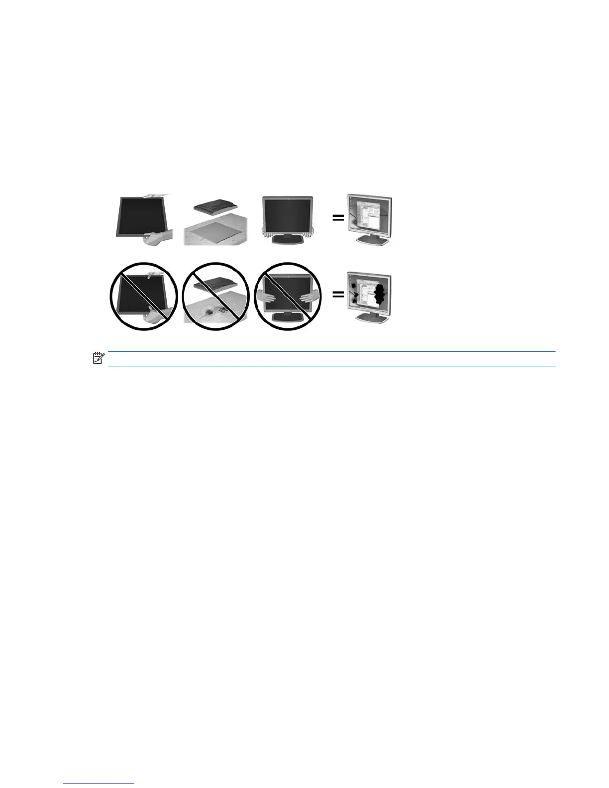 cause nonuniformity of color or disorientation of the liquid crystals. If this occurs the screen will not recover