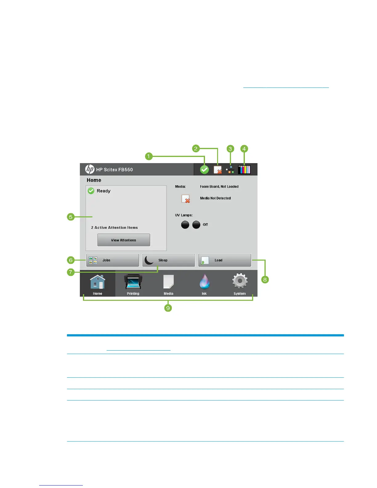 5 Printer status — Indicates whether the printer is ready to print, and lists any error messages.