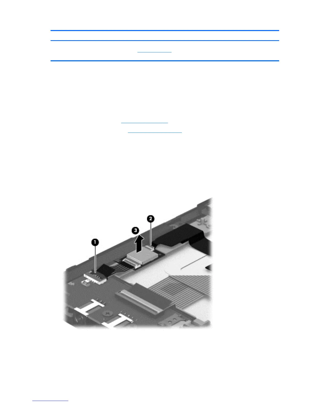 1. Release the audio/power connector board ZIF connector (1) to which the NFC module cable is attached,
