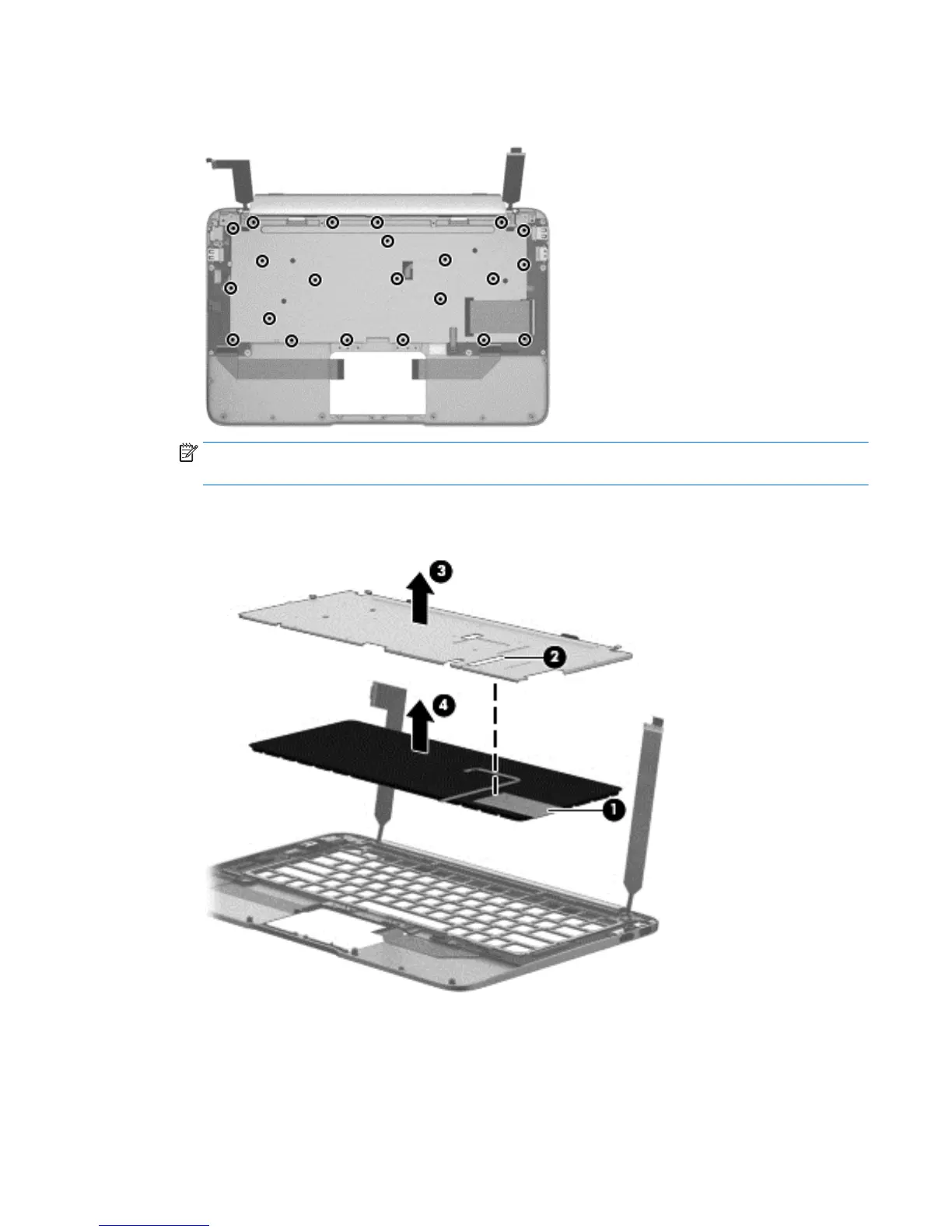 NOTE: As the keyboard shield is being removed, make sure the keyboard cable (1) routes smoothly