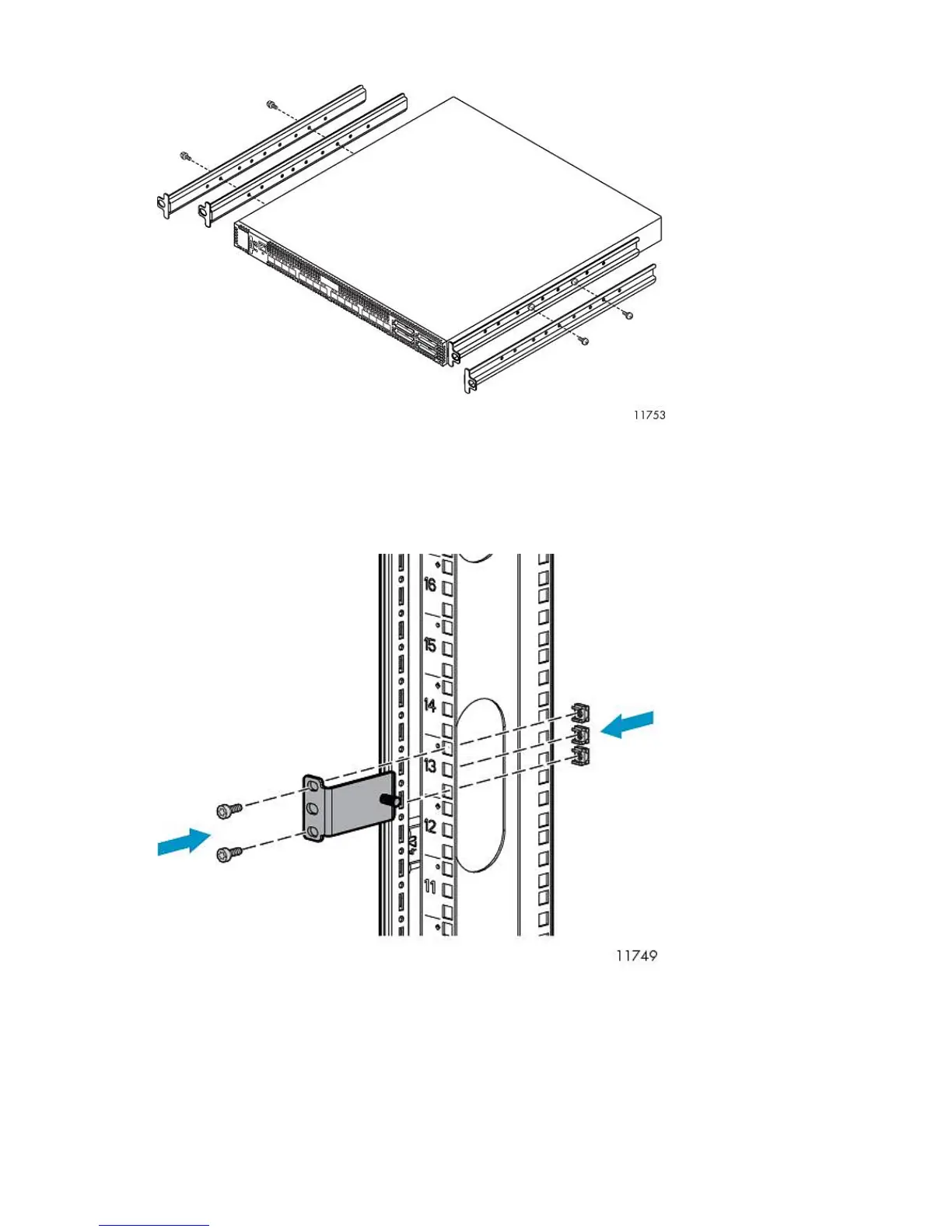 2. From the front of the rack, secure the adjustable mounting flanges to the marked holes, using