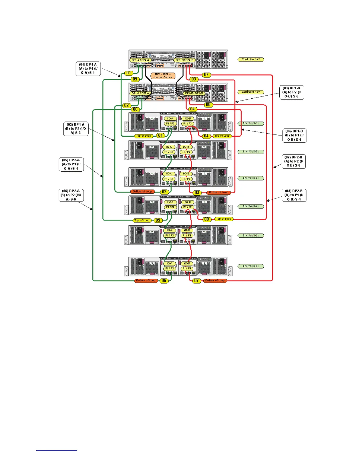 Figure 18 shows a fully cabled EVA6400 system with two controllers and six disk enclosures (2C6D).