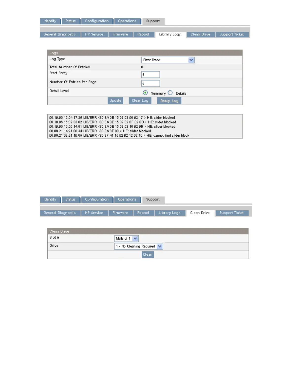 Use the Support: Clean Drive page to clean the tape drives.