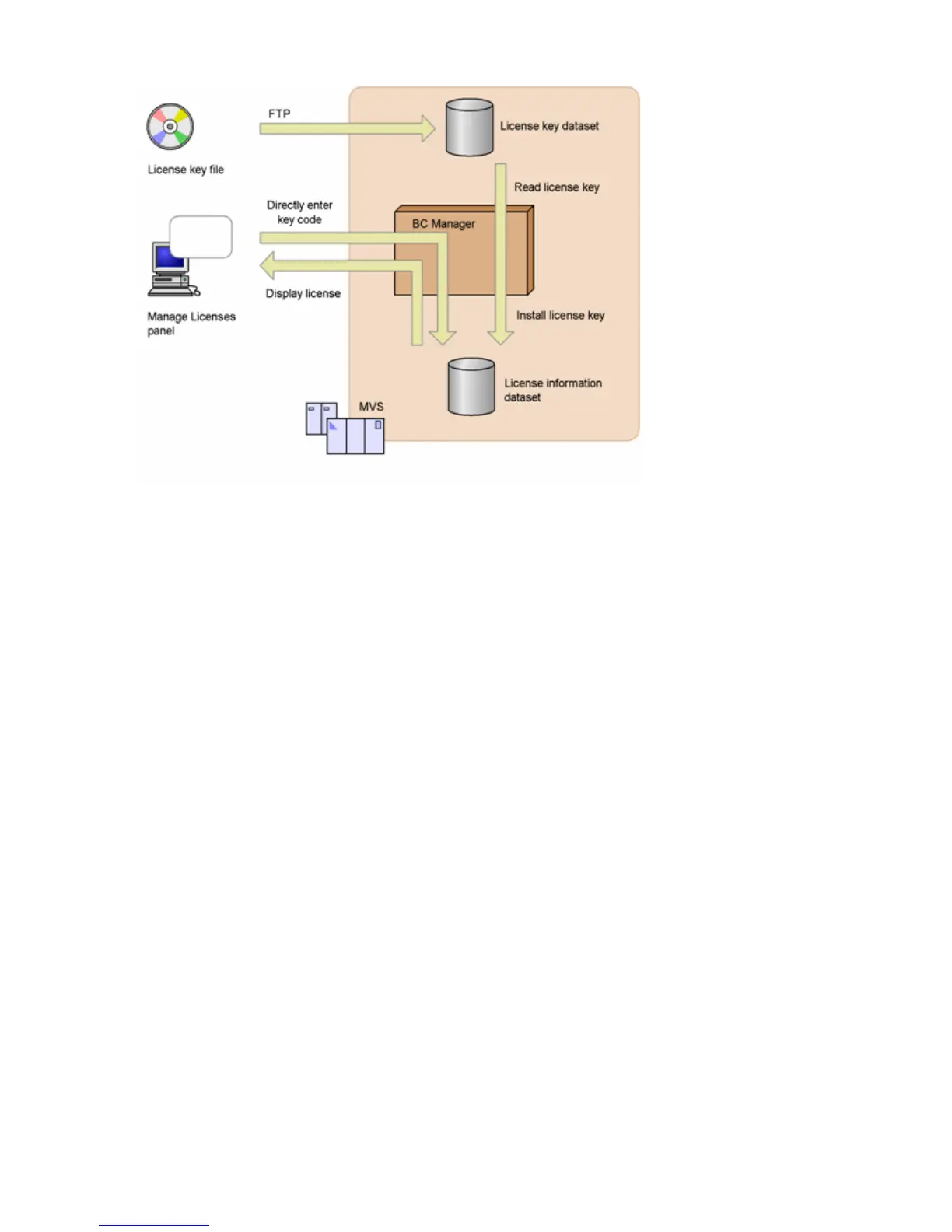 With this method, you transfer the obtained license key file to MVS and use the Manage Licenses