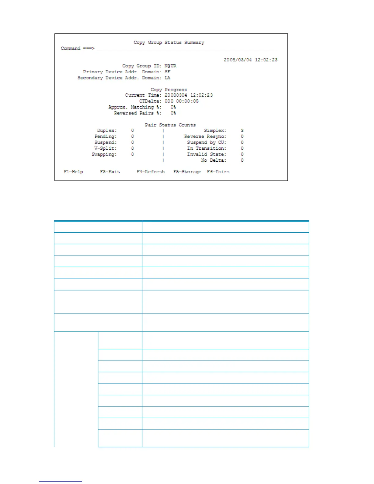 “Contents of the Copy Group Status Summary Panel” (page 122) describes the items in the Copy