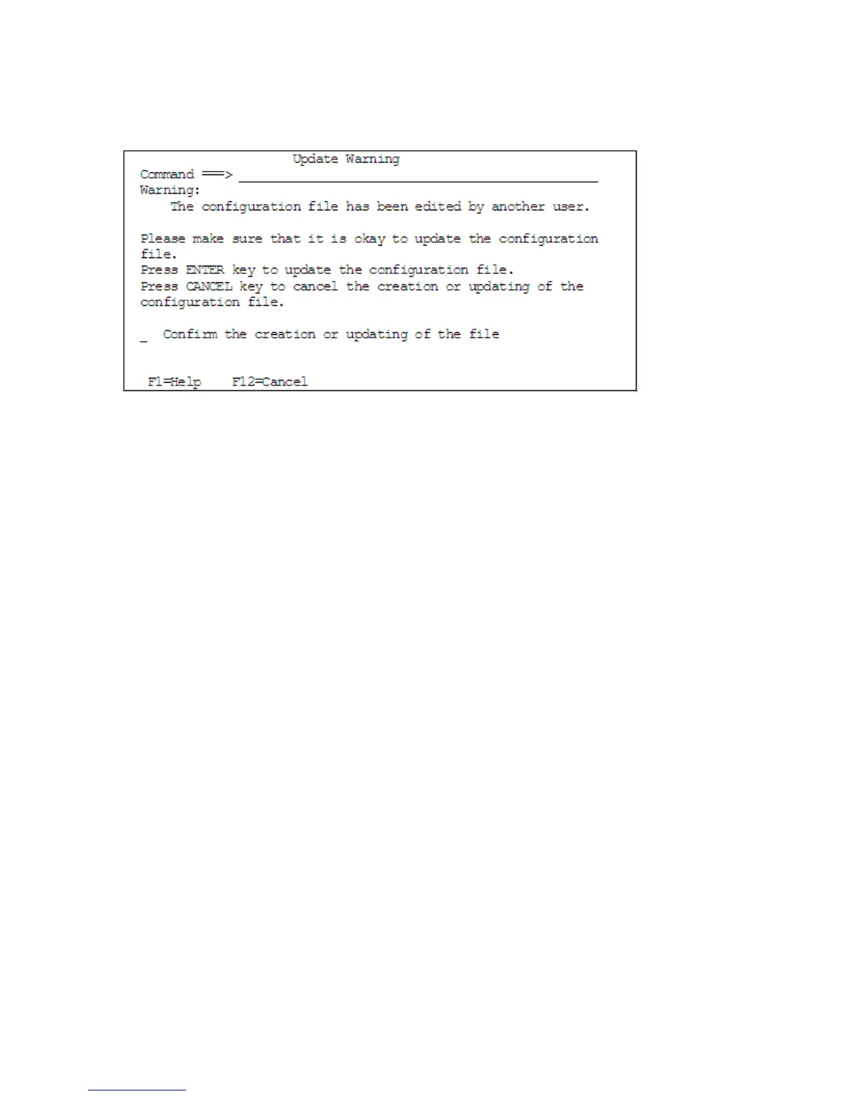 Pressing the Enter key will overwrite the configuration file. Pressing the F12=Cancel key will stop