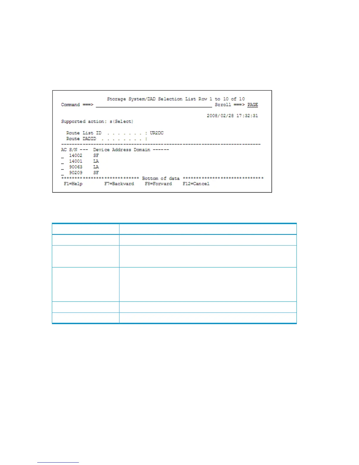 Table 37 Contents of the Storage System/DAD Selection List Panel