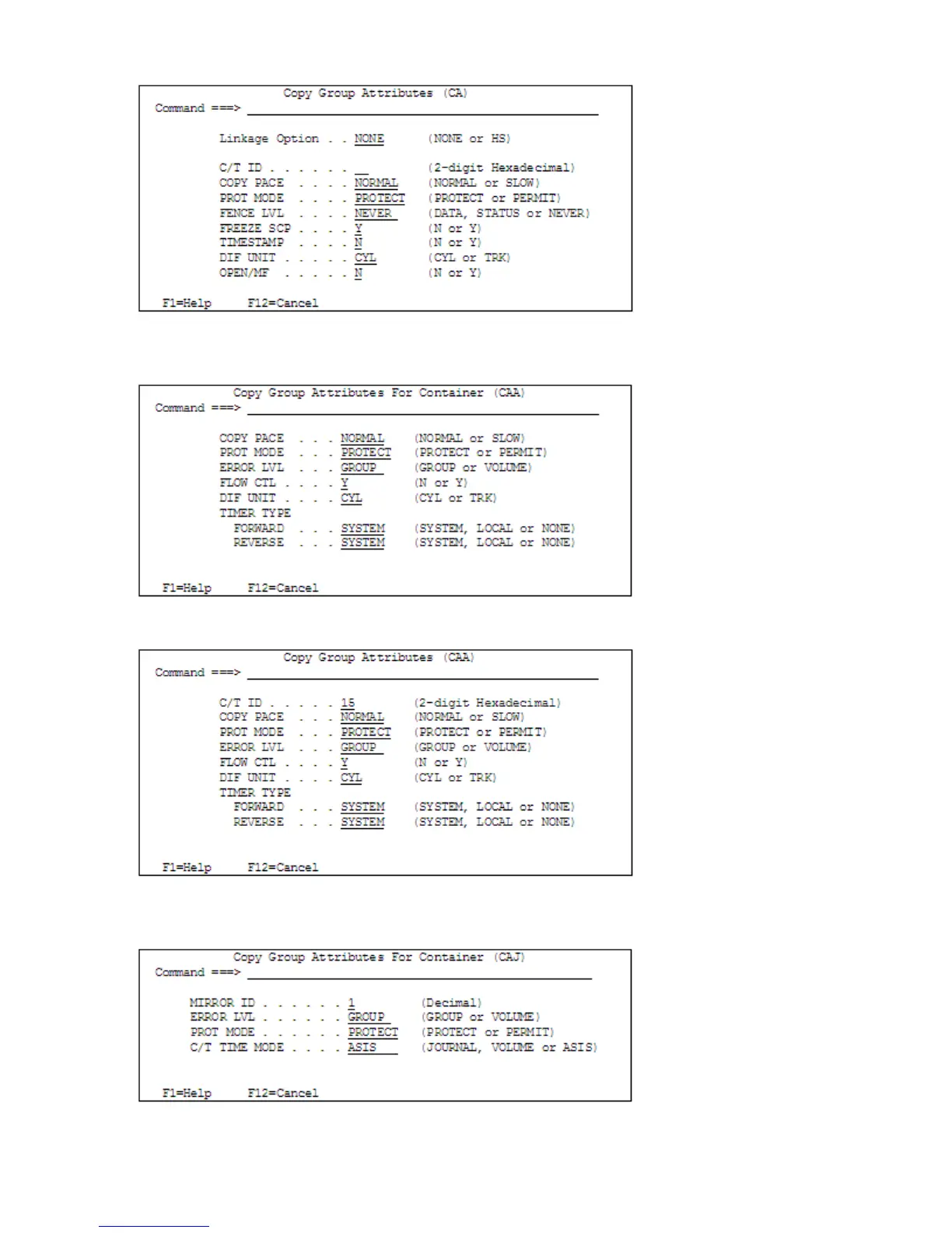 Figure 71 Copy Group Attributes (CAA) Panel (for CAA Copy Groups that are not CG Containers)