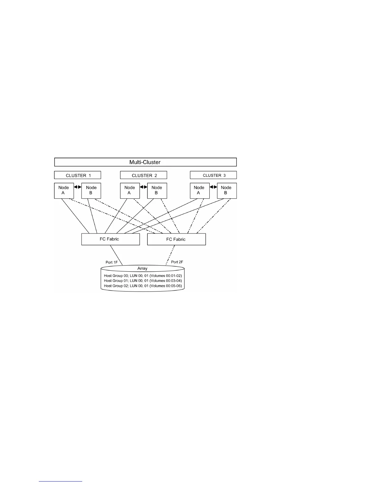 multi-cluster environment with three clusters, each containing two nodes. The nodes share access
