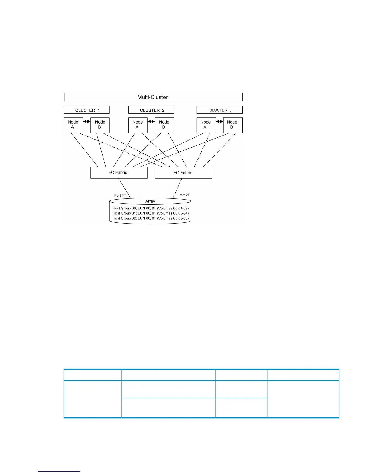 multi-cluster environment with three clusters, each containing two nodes. The nodes share access