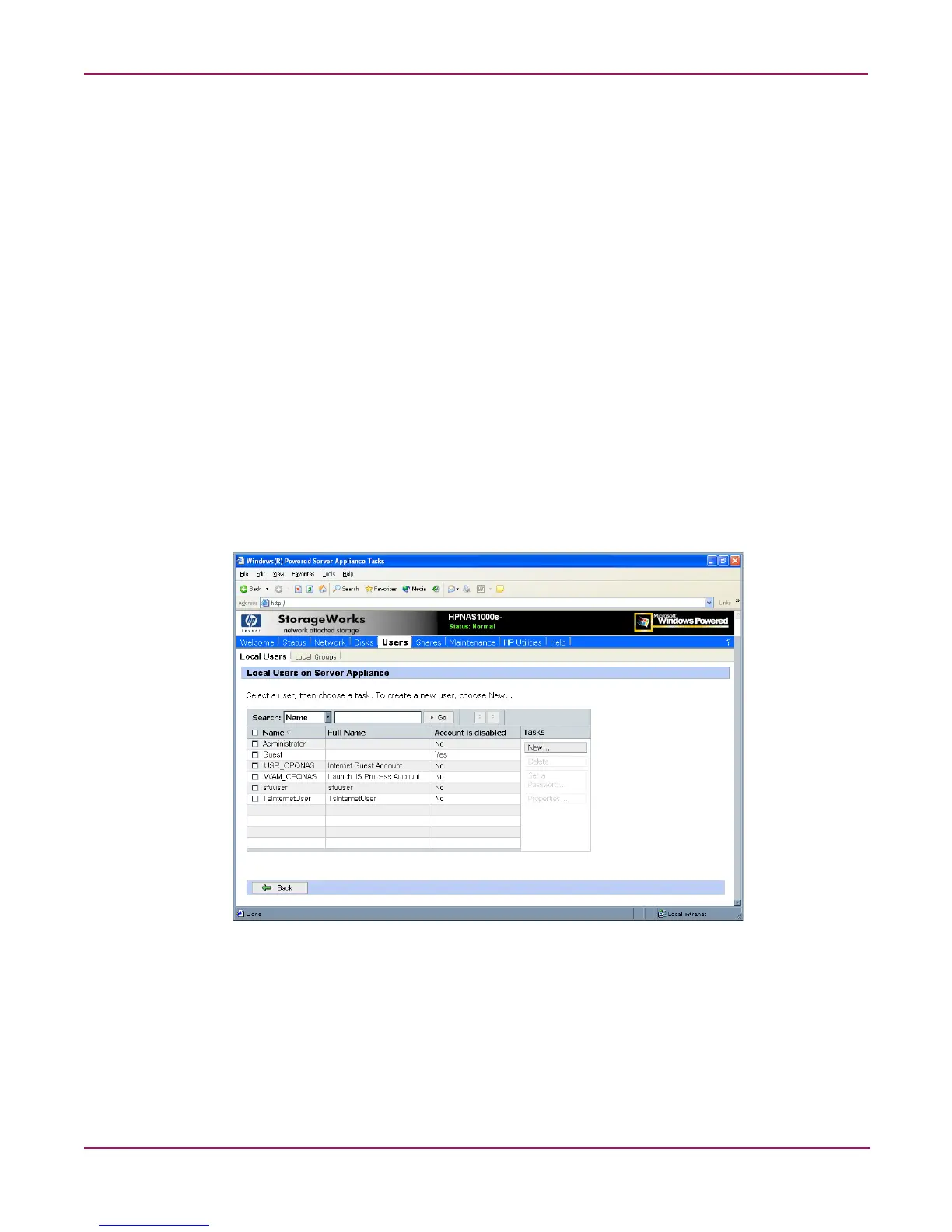 All workgroup user administration tasks are performed in the Local Users dialog box.