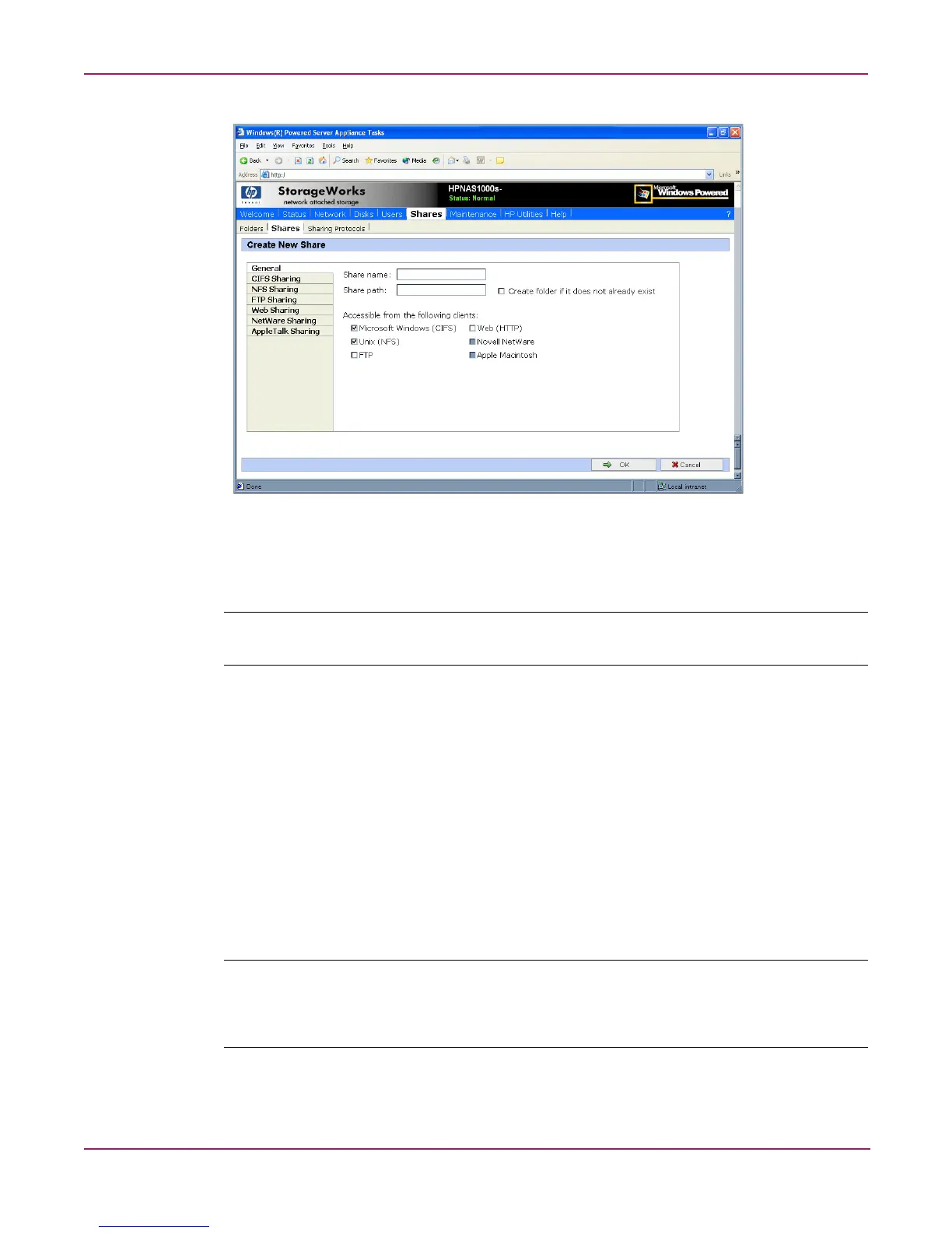 ■ While working with file shares in the Shares dialog boxes, the administrator can create,