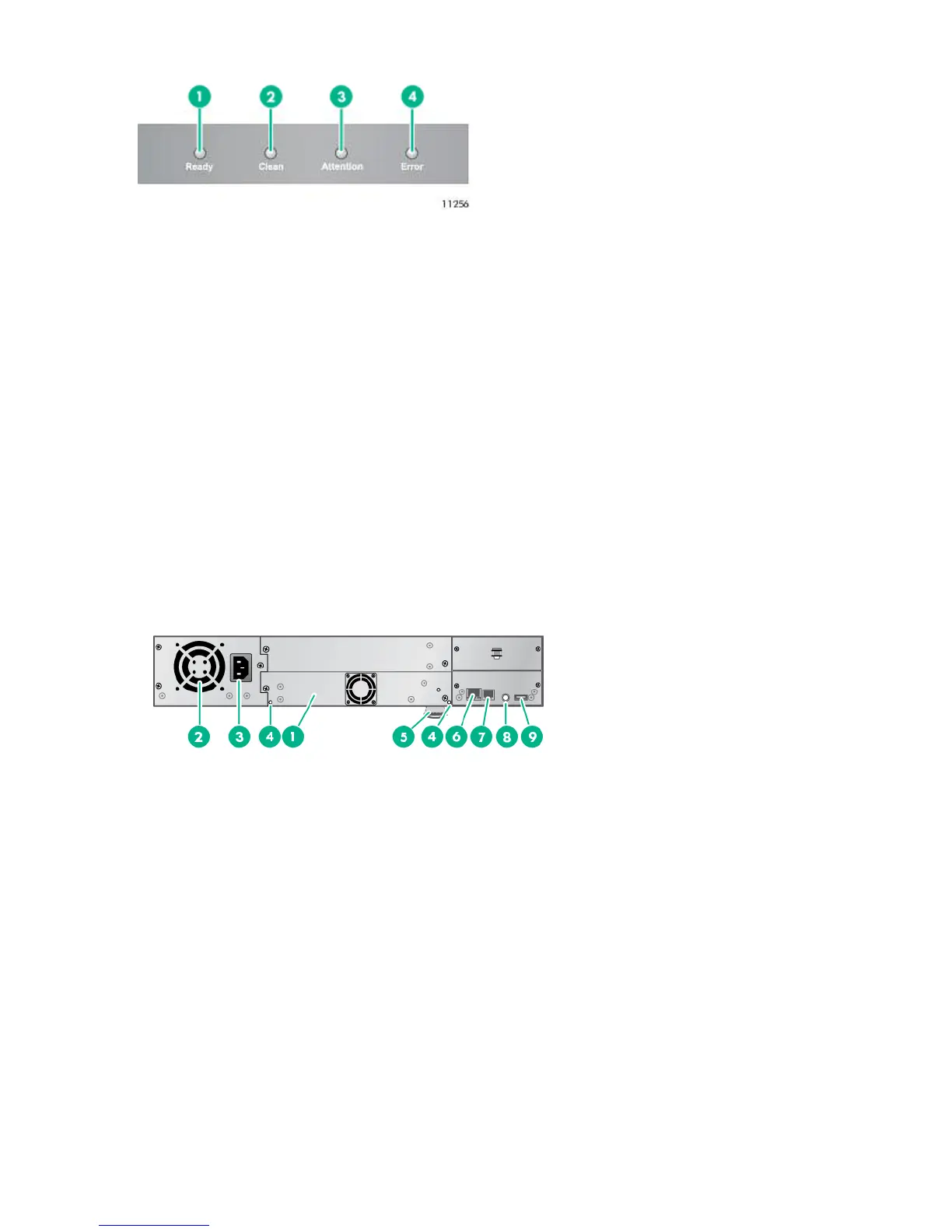 Ready. Illuminated when power is on. Blinking when there is tape drive or robotics activity.Green1.