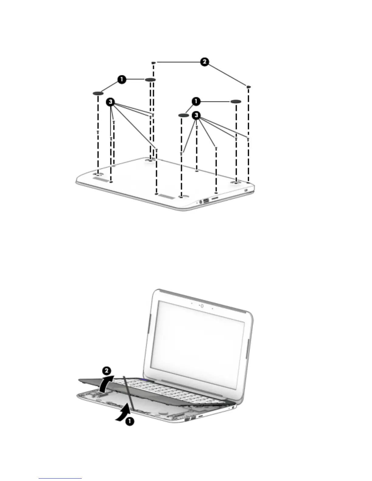 7. Lift the front edge (2) of the keyboard/top cover until it separates from the front edge of