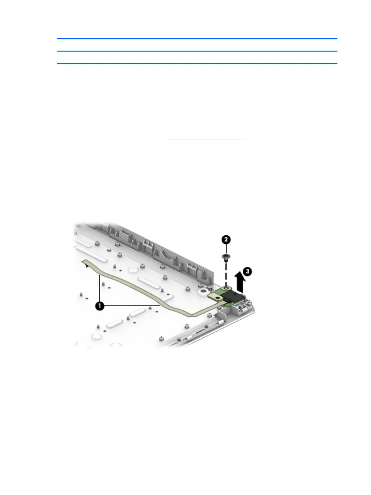 2. Detach the power button board cable (1) from the keyboard/top cover. (The power button board cable is