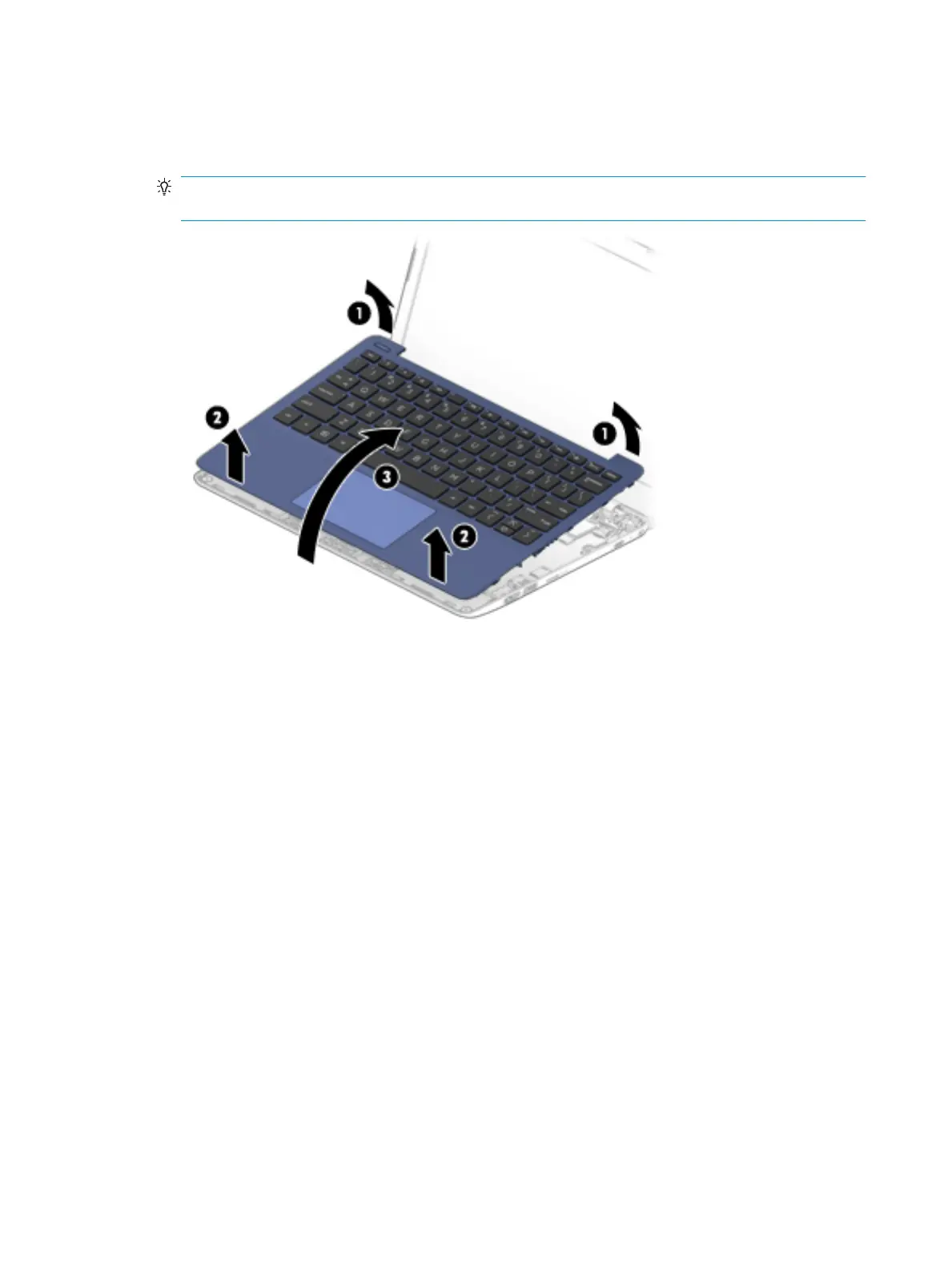 7. Work around the edges to the bottom of the top cover (2), and then lift the bottom of the keyboard/top