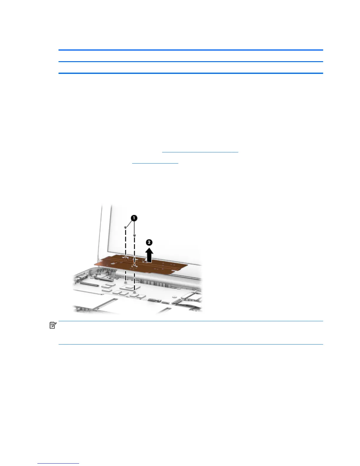 1. Remove the two Phillips PM2.0×2.0 screws (1) that secure the heat sink to the system board.