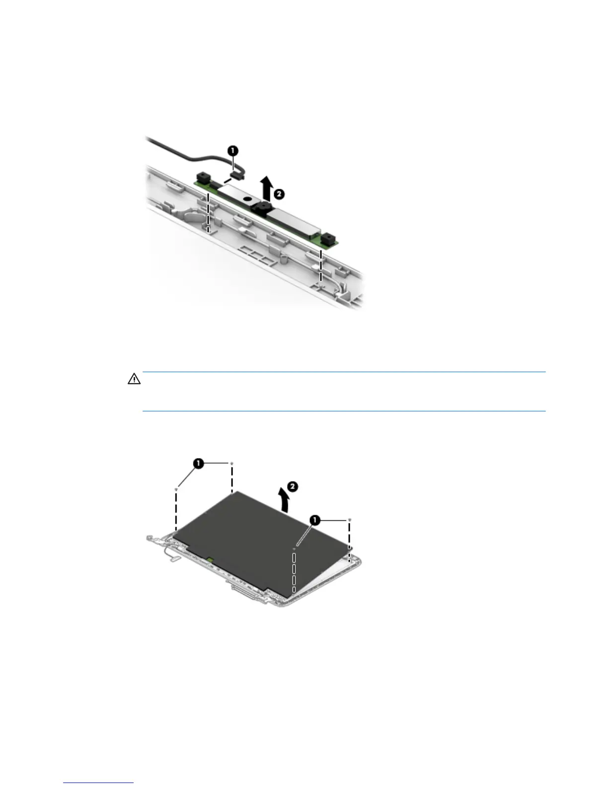 b. Lift the top edge of the display panel (2) and swing it up and forward until it rests upside down in