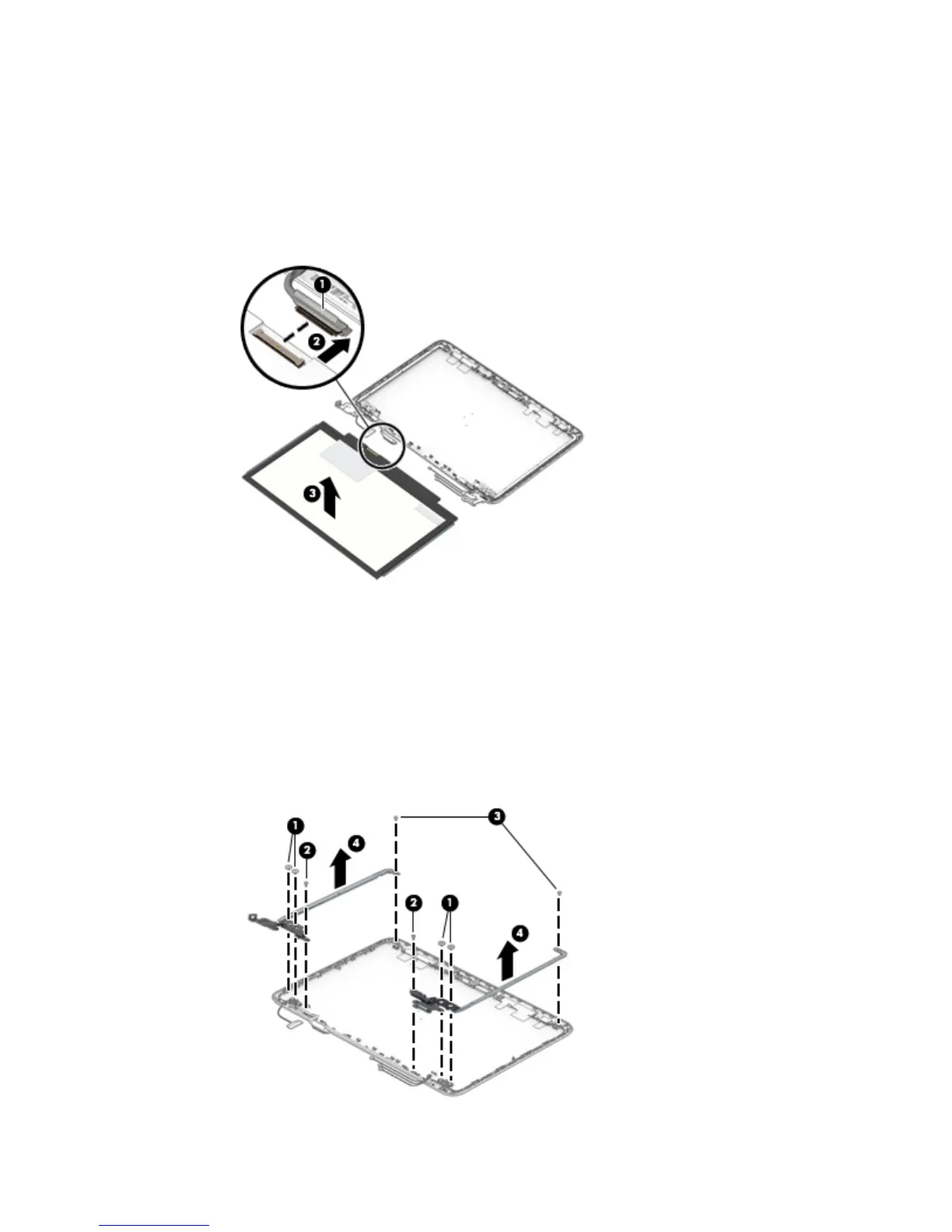 a. Remove the four Phillips PM2.5×3.0 broad head screws (1) that secure the display hinges to the