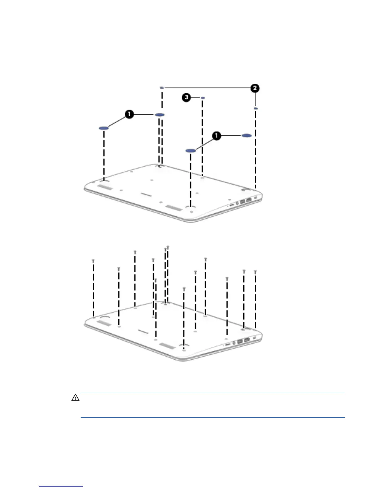 5. Remove one screw cover (3) from the middle rear of the computer bottom.