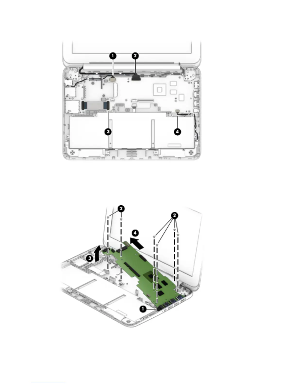 8. Remove the system board (4) by sliding it up and to the left at an angle.