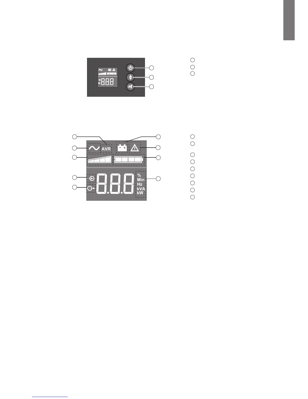 The LCD window provides useful information about the UPS, load status, events, measurements, and settings.