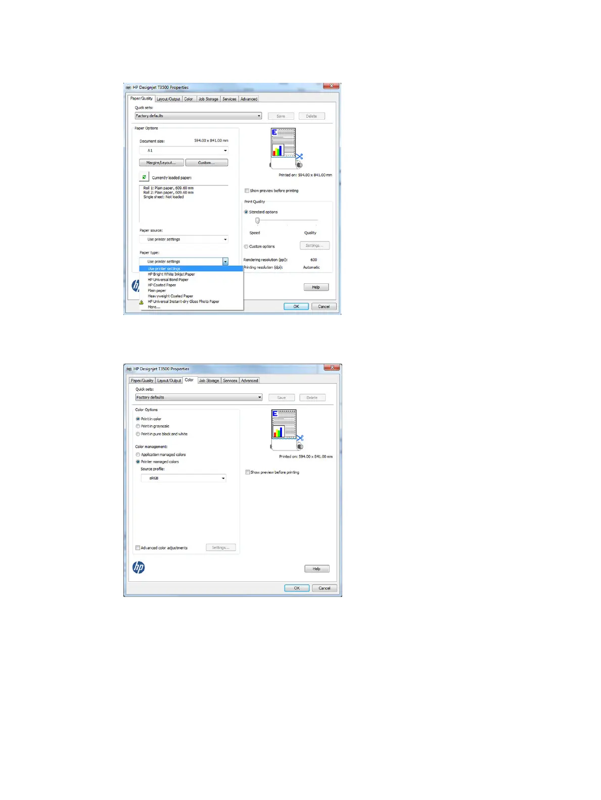 3. You may wish to change the default paper source, paper type, and print quality.