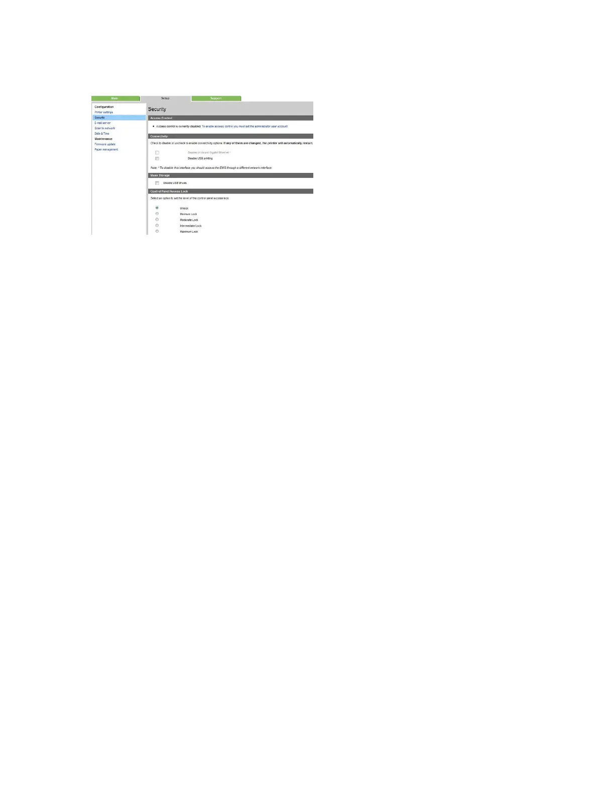 To control access to the Printer front panel from the Embedded Web Server, go the Setup tab, and select