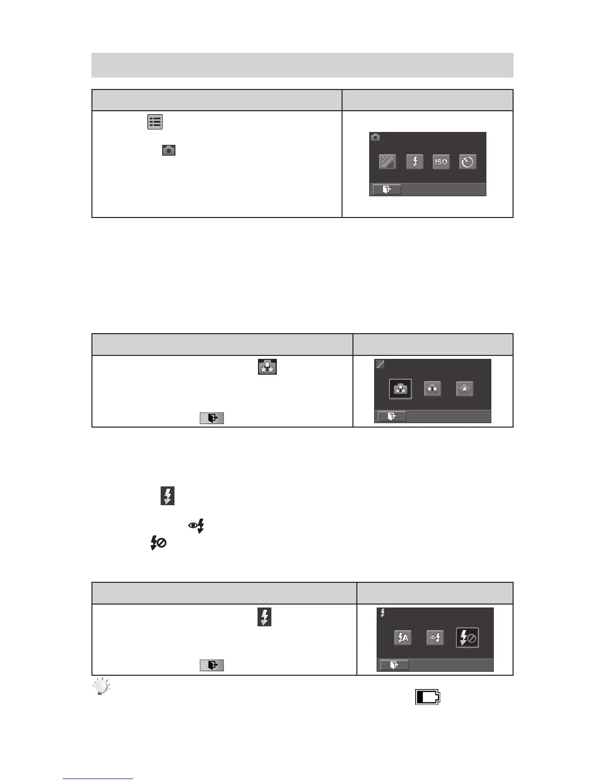 Flash Auto ( • ):The ash res automatically according to light conditions. Use this mode for