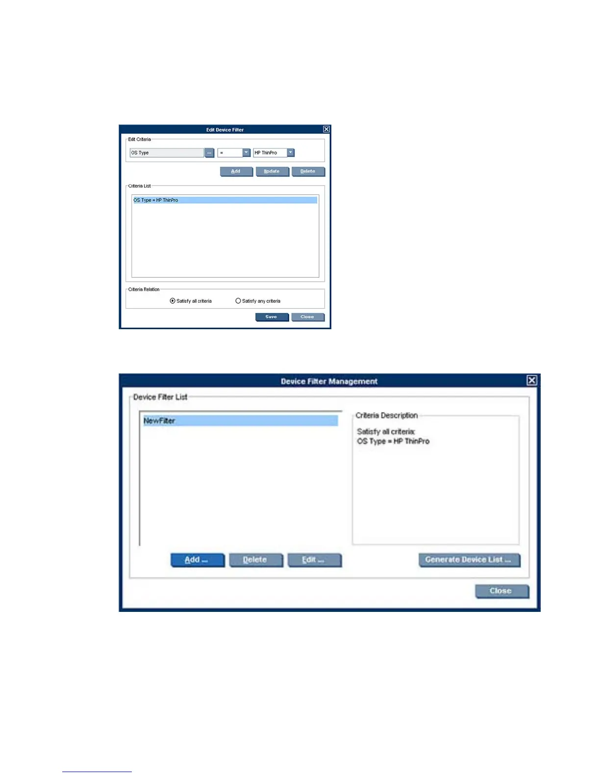 criteria. Then click Save to return to the Device Filter Management dialog box.