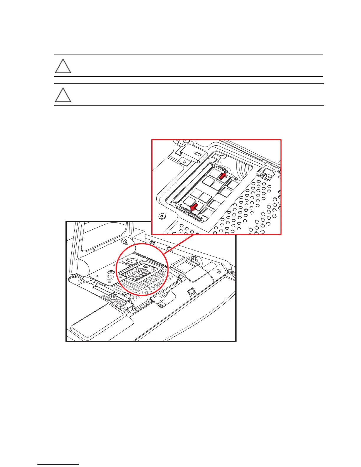 latch at a time. The memory module pops up at an angle. Both memory modules can be removed by