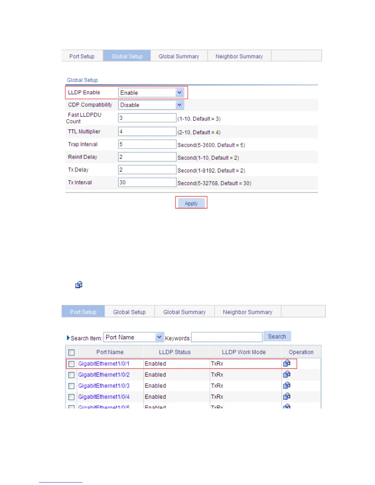 Select Network LLDP from the navigation tree to enter the Port Setup tab, as shown in e. Click the