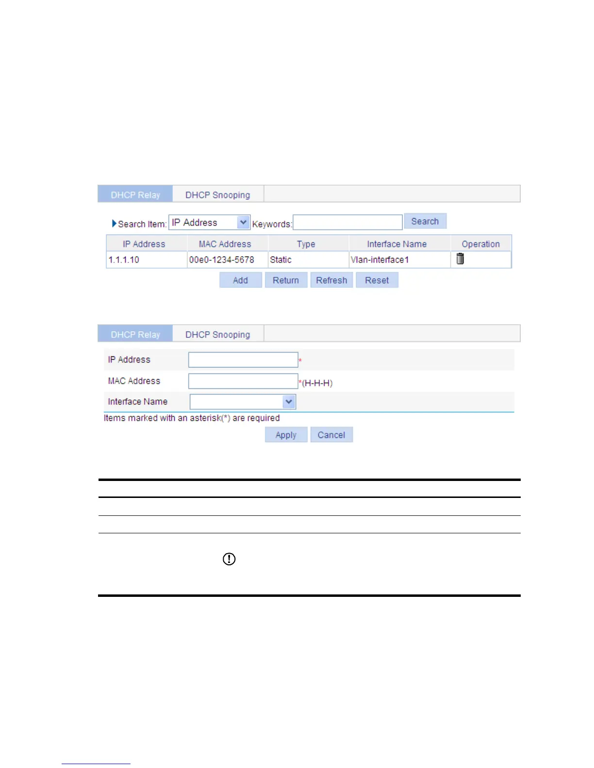 The interface of a static binding entry must be configured as a DHCP relay agent;