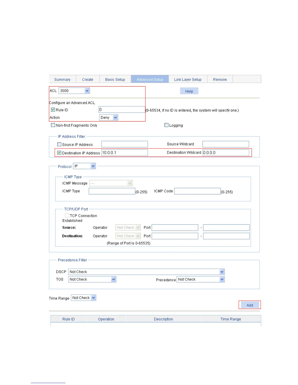# Configure the ACL to deny packets with destination IP address 10.0.0.1.