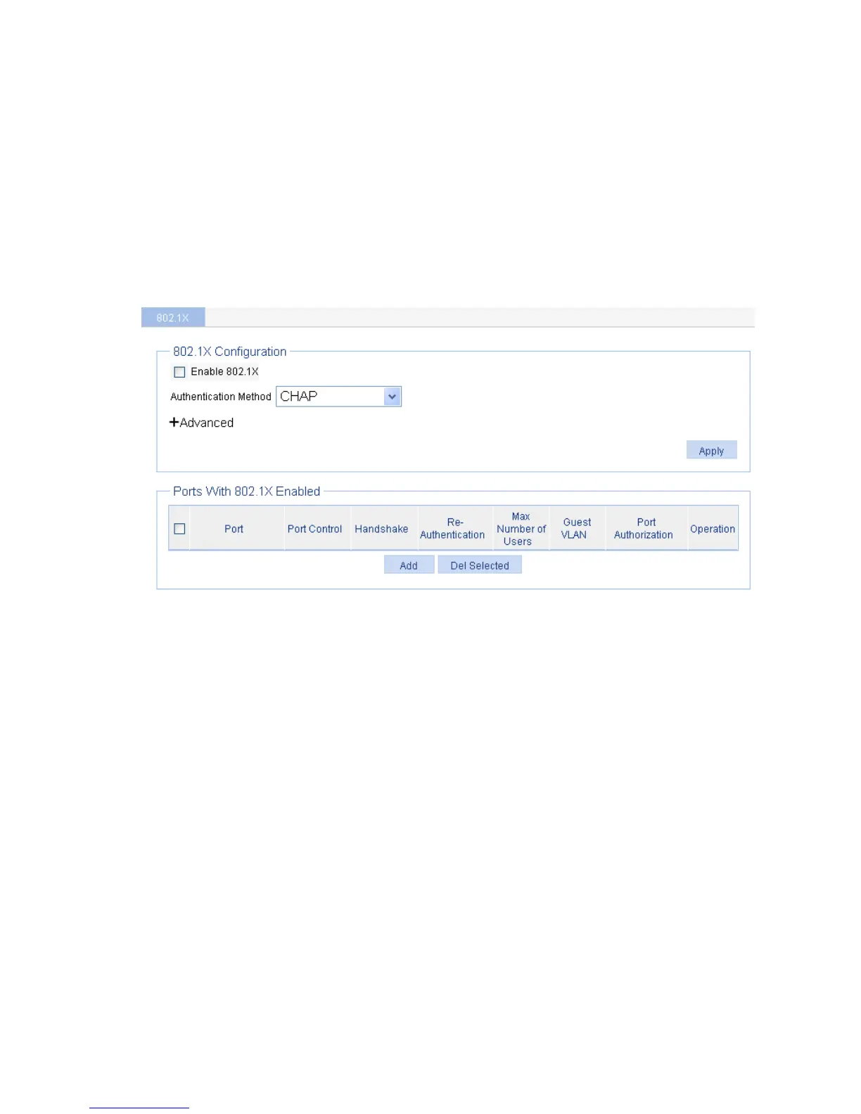 From the navigation tree, select Authentication 802.1X to enter the 802.1X configuration page.