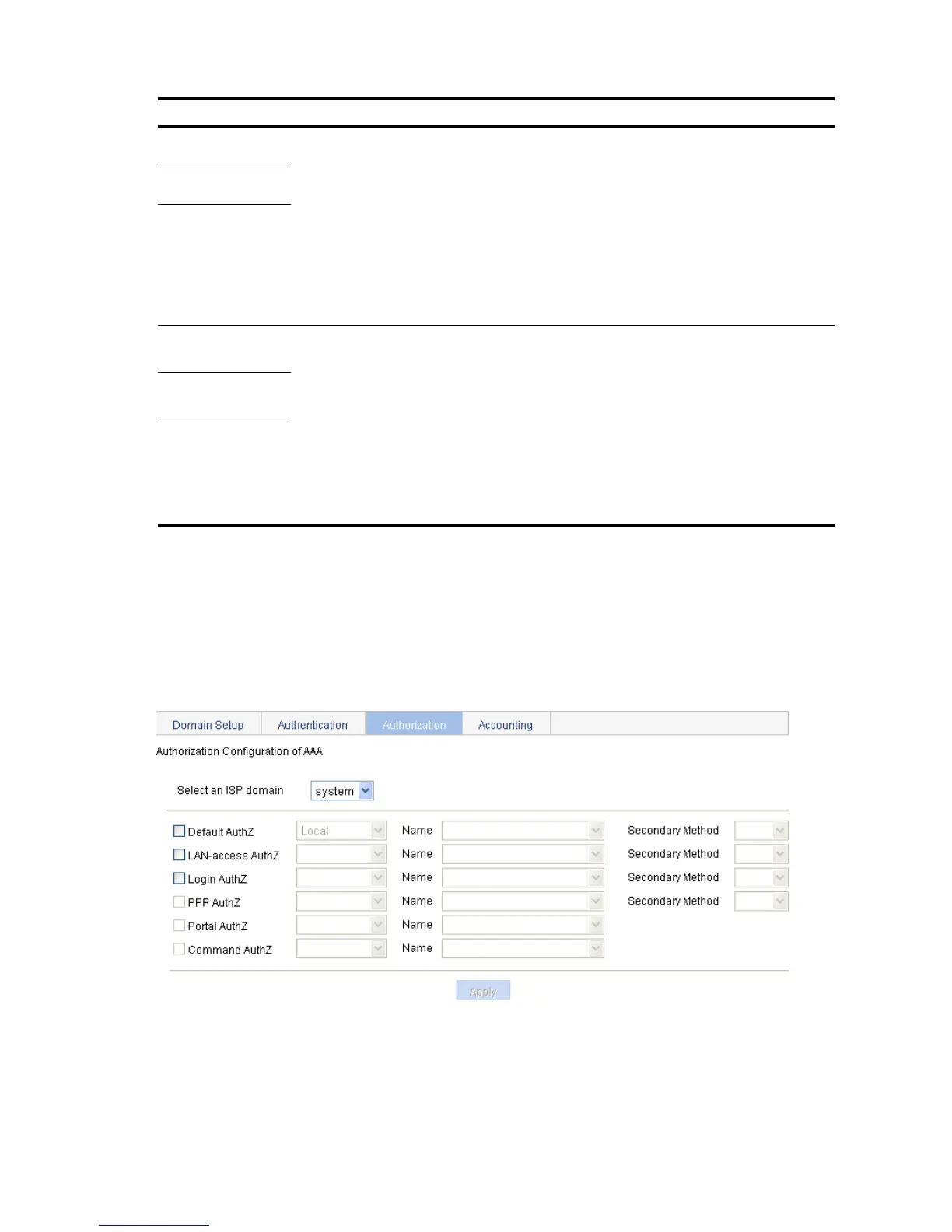 Select Authentication AAA from the navigation tree and then select the Authorization tab to enter the